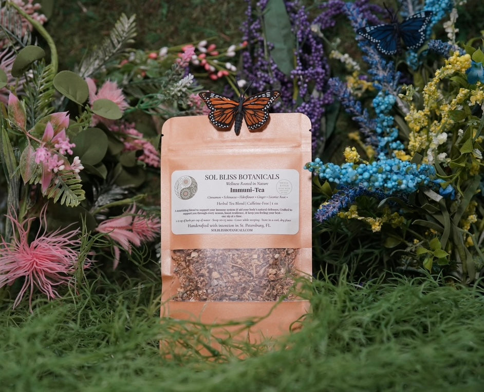 Our Immuni-Tea blend combines the strengthening power of Echinacea and Elderflower to naturally support immune defense and resilience. Spicy notes of Cinnamon and Ginger ignite inner warmth and circulation, helping the body ward off seasonal imbalances. Licorice Root adds a soothing sweetness while supporting respiratory and adrenal health. This comforting tea nourishes the body from within, offering a grounding, revitalizing ritual perfect for moments of vulnerability, travel, or changing seasons.